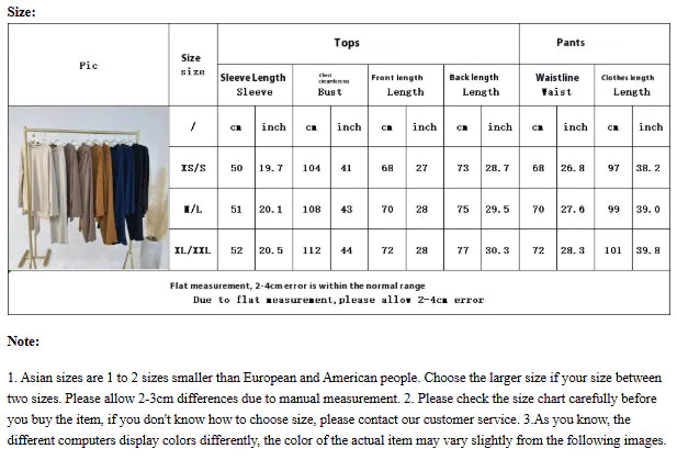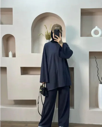 Elevate your style with this Middle Eastern-inspired loose two-piece set, featuring a long-sleeve top and trousers in solid colors. Made from a soft cotton blend for ultimate comfort, it's perfect for a chic and modest look. Available in 7 colors and multiple sizes. Each set includes the top and pants.
